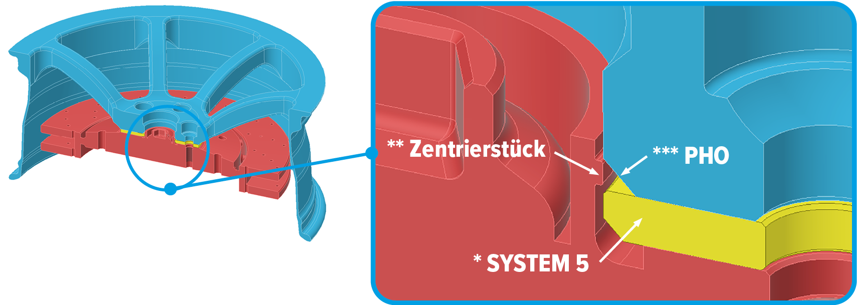 Eine System-5-Scheibe* lässt sich nicht korrekt montieren bzw. zentrieren, da die Nabe vor und hinter dem kleinen Zentrierstück** hinterdreht ist. Dieses Zentrierstück liegt bei der Montage einer System-5-Scheibe genau in der Fase (PHO)*** der Felge. Dadurch ist keine ordnungsgemäße Zentrierung der Felge möglich.